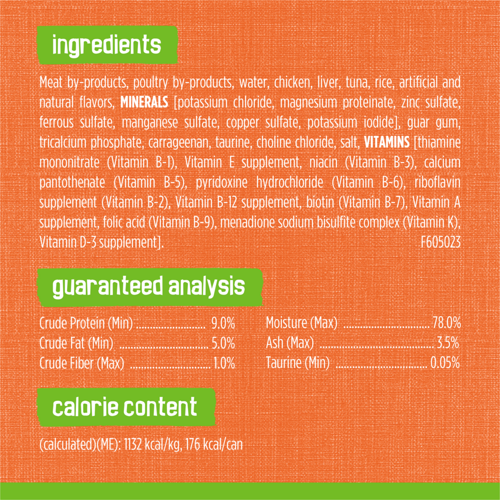 Meat by-products, poultry by-products, water sufficient for processing, chicken, liver, tuna, rice, artificial and natural flavors, added color, guar gum, tricalcium phosphate, potassium chloride, carrageenan, salt, magnesium sulfate, mono and dicalcium phosphate, taurine, choline chloride, thiamine mononitrate, Vitamin E supplement, zinc sulfate, ferrous sulfate, niacin, calcium pantothenate, Vitamin A supplement, copper sulfate, manganese sulfate, menadione sodium bisulfite complex (Vitamin K), pyridoxine hydrochloride, riboflavin supplement, Vitamin B-12 supplement, biotin, folic acid, Vitamin D-3 supplement, potassium iodide. C-6050