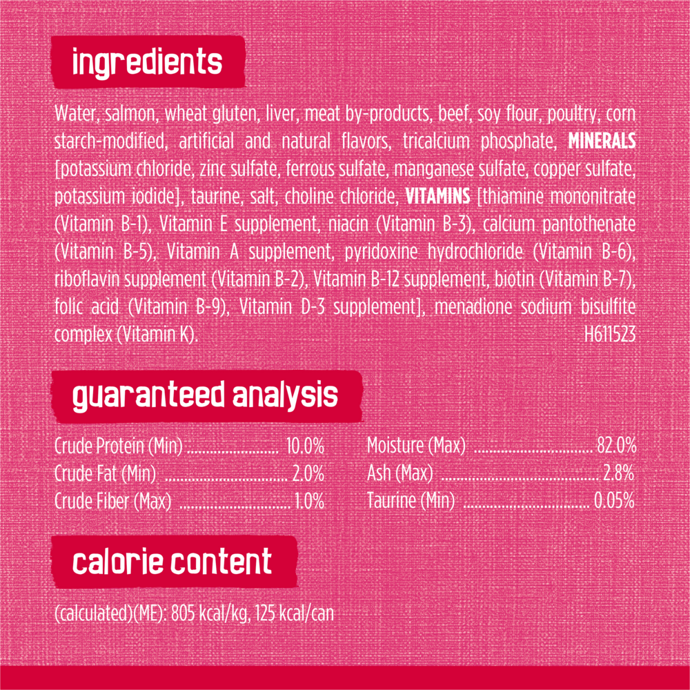 Water, Salmon, Wheat Gluten, Liver, Meat By-Products, Beef, Soy Flour, Turkey, Corn Starch-Modified, Artificial And Natural Flavors, Added Color, Tricalcium Phosphate, Minerals [Potassium Chloride, Zinc Sulfate, Ferrous Sulfate, Manganese Sulfate, Copper Sulfate, Potassium Iodide], Red 3, Taurine, Salt, Choline Chloride, Vitamins [Thiamine Mononitrate (Vitamin B-1), Vitamin E Supplement, Niacin (Vitamin B-3), Calcium Pantothenate (Vitamin B-5), Vitamin A Supplement, Menadione Sodium Bisulfite Complex (Vitamin K), Pyridoxine Hydrochloride (Vitamin B-6), Riboflavin Supplement (Vitamin B-2), Vitamin B-12 Supplement, Biotin (Vitamin B-7), Folic Acid (Vitamin B-9), Vitamin D-3 Supplement].