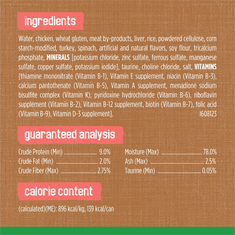 Water, Chicken, Wheat Gluten, Meat By-Products, Liver, Rice, Powdered Cellulose, Corn Starch-Modified, Turkey, Spinach, Artificial And Natural Flavors, Soy Flour, Tricalcium Phosphate, Minerals [Potassium Chloride, Zinc Sulfate, Ferrous Sulfate, Manganese Sulfate, Copper Sulfate, Potassium Iodide], Added Color, Taurine, Choline Chloride, Salt, Vitamins [Thiamine Mononitrate (Vitamin B-1), Vitamin E Supplement, Niacin (Vitamin B-3), Calcium Pantothenate (Vitamin B-5), Vitamin A Supplement, Menadione Sodium Bisulfite Complex (Vitamin K), Pyridoxine Hydrochloride (Vitamin B-6), Riboflavin Supplement (Vitamin B-2), Vitamin B-12 Supplement, Biotin (Vitamin B-7), Folic Acid (Vitamin B-9), Vitamin D-3 Supplement], Xanthan Gum, H608118.