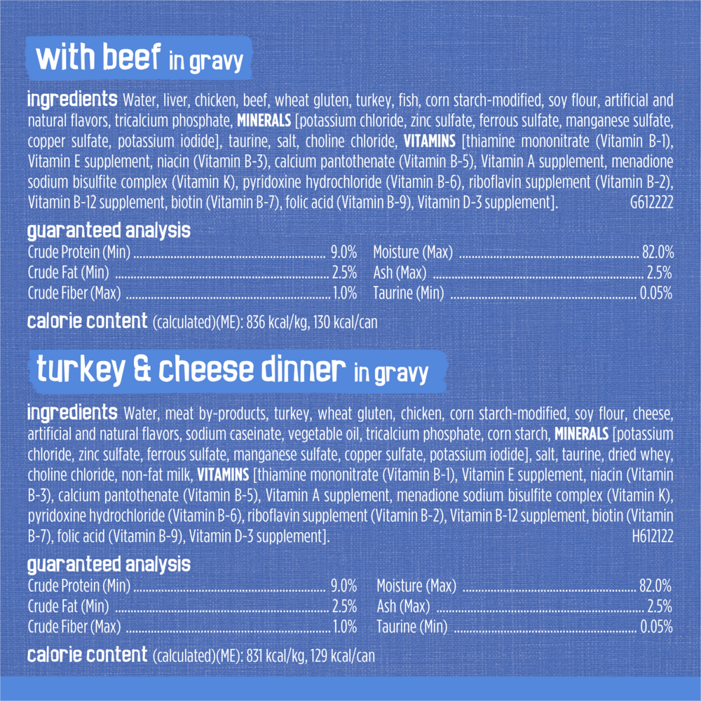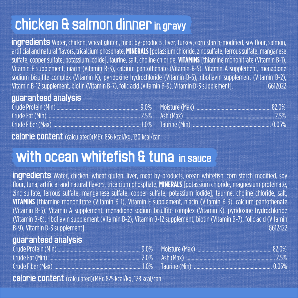 With Beef In Gravy: Water, Liver, Chicken, Beef, Wheat Gluten, Turkey, Ocean Fish, Corn Starch-Modified, Soy Flour, Artificial And Natural Flavors, Added Color, Tricalcium Phosphate, Minerals [Potassium Chloride, Zinc Sulfate, Ferrous Sulfate, Manganese Sulfate, Copper Sulfate, Potassium Iodide] Taurine, Salt, Choline Chloride, Vitamins [Thiamine Mononitrate (Vitamin B-1), Vitamin E Supplement, Niacin (Vitamin B-3), Calcium Pantothenate (Vitamin B-5), Vitamin A Supplement, Menadione Sodium Bisulfite Complex (Vitamin K), Pyridoxine Hydrochloride (Vitamin B-6), Riboflavin Supplement (Vitamin B-2), Vitamin B-12 Supplement, Biotin (Vitamin B-7), Folic Acid (Vitamin B-9), Vitamin D-3 Supplement]. F612218; Turkey & Cheese Dinner In Gravy: Water, Meat By-Products, Turkey, Wheat Gluten, Chicken, Vegetable Starch-Modified, Soy Flour, Artificial And Natural Flavors, Cheese, Sodium Caseinate, Vegetable Oil, Tricalcium Phosphate, Corn Starch, Minerals [Potassium Chloride, Zinc Sulfate, Ferrous Sulfate, Manganese Sulfate, Copper Sulfate, Potassium Iodide], Salt, Taurine, Dried Whey, Added Color, Choline Chloride, Vitamins [Thiamine Mononitrate (Vitamin B-1), Vitamin E Supplement, Niacin (Vitamin B-3), Calcium Pantothenate (Vitamin B-5), Vitamin A Supplement, Menadione Sodium Bisulfite Complex (Vitamin K), Pyridoxine Hydrochloride (Vitamin B-6), Riboflavin Supplement (Vitamin B-2), Vitamin B-12 Supplement, Biotin (Vitamin B-7), Folic Acid (Vitamin B-9), Vitamin D-3 Supplement], Sorbic Acid (A Preservative). G612118; With Ocean Whitefish & Tuna In Sauce: Water, Liver, Turkey, Wheat Gluten, Chicken, Ocean Whitefish, Meat By-Products, Corn Starch-Modified, Soy Flour, Tuna, Artificial And Natural Flavors, Tricalcium Phosphate, Minerals [Potassium Chloride, Magnesium Sulfate, Zinc Sulfate, Ferrous Sulfate, Copper Sulfate, Manganese Sulfate, Potassium Iodide], Added Color, Taurine, Choline Chloride, Salt, Vitamins [Thiamine Mononitrate (Vitamin B-1), Vitamin E Supplement, Niacin (Vitamin B-3), Calcium Pantothenate (Vitamin B-5), Vitamin A Supplement, Menadione Sodium Bisulfite Complex (Vitamin K), Pyridoxine Hydrochloride (Vitamin B-6), Riboflavin Supplement (Vitamin B-2), Vitamin B-12 Supplement, Biotin (Vitamin B-7), Folic Acid (Vitamin B-9), Vitamin D-3 Supplement]. F612418; Chicken & Salmon Dinner In Gravy: Water, Meat By-Products, Chicken, Wheat Gluten, Turkey, Corn Starch-Modified, Soy Flour, Salmon, Artificial And Natural Flavors, Tricalcium Phosphate, Minerals [Potassium Chloride, Zinc Sulfate, Ferrous Sulfate, Manganese Sulfate, Copper Sulfate, Potassium Iodide], Taurine, Added Color, Salt, Choline Chloride, Red 3, Vitamins [Thiamine Mononitrate (Vitamin B-1), Vitamin E Supplement, Niacin (Vitamin B-3), Calcium Pantothenate (Vitamin B-5), Vitamin A Supplement, Menadione Sodium Bisulfite Complex (Vitamin K), Pyridoxine Hydrochloride (Vitamin B-6), Riboflavin Supplement (Vitamin B-2), Vitamin B-12 Supplement, Biotin (Vitamin B-7), Folic Acid (Vitamin B-9), Vitamin D-3 Supplement], Xanthan Gum