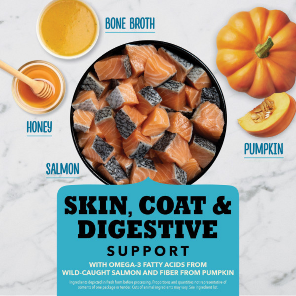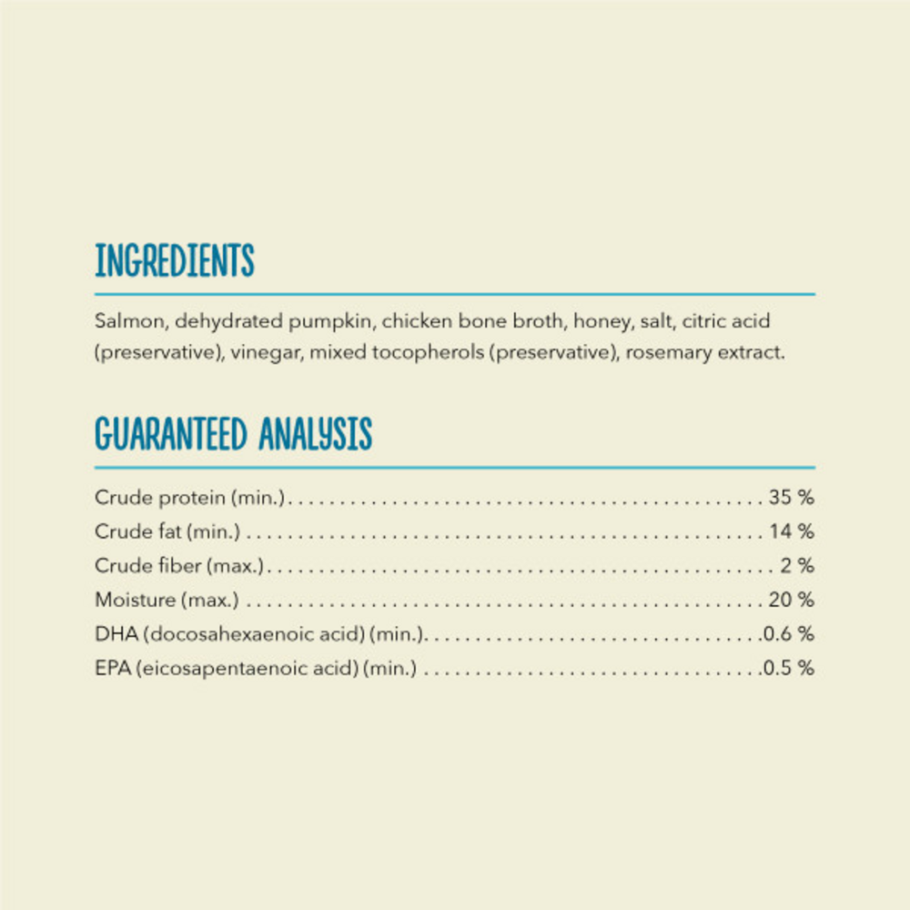 Salmon, dehydrated pumpkin, chicken bone broth, honey, salt, citric acid (preservative), vinegar, mixed tocopherols (preservative), rosemary extract.
